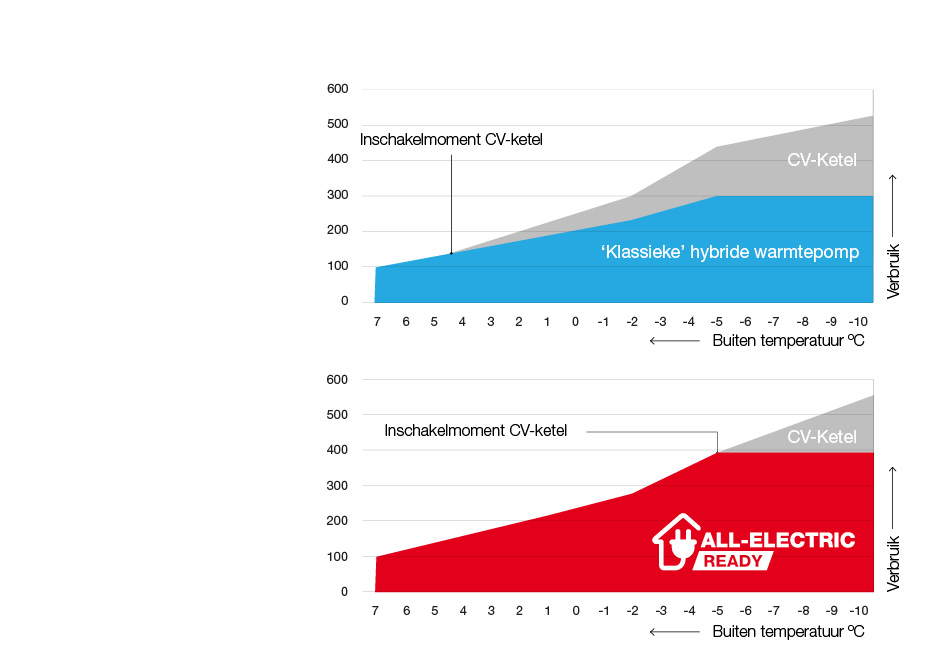 De klassieke hybride warmtepomp is een oplossing voor de korte termijn en daarom een stuk minder duurzaam dan het All-Electric Ready-concept. In deze grafieken wordt dit duidelijk gemaakt. Met een klassieke hybride opstelling blijft de cv-ketel door het gebrek aan vermogen (bij lage temperaturen) nog veel in bedrijf en is de stap naar all-electric nog ver weg. En met de bestaande hybride installaties zelfs onhaalbaar.