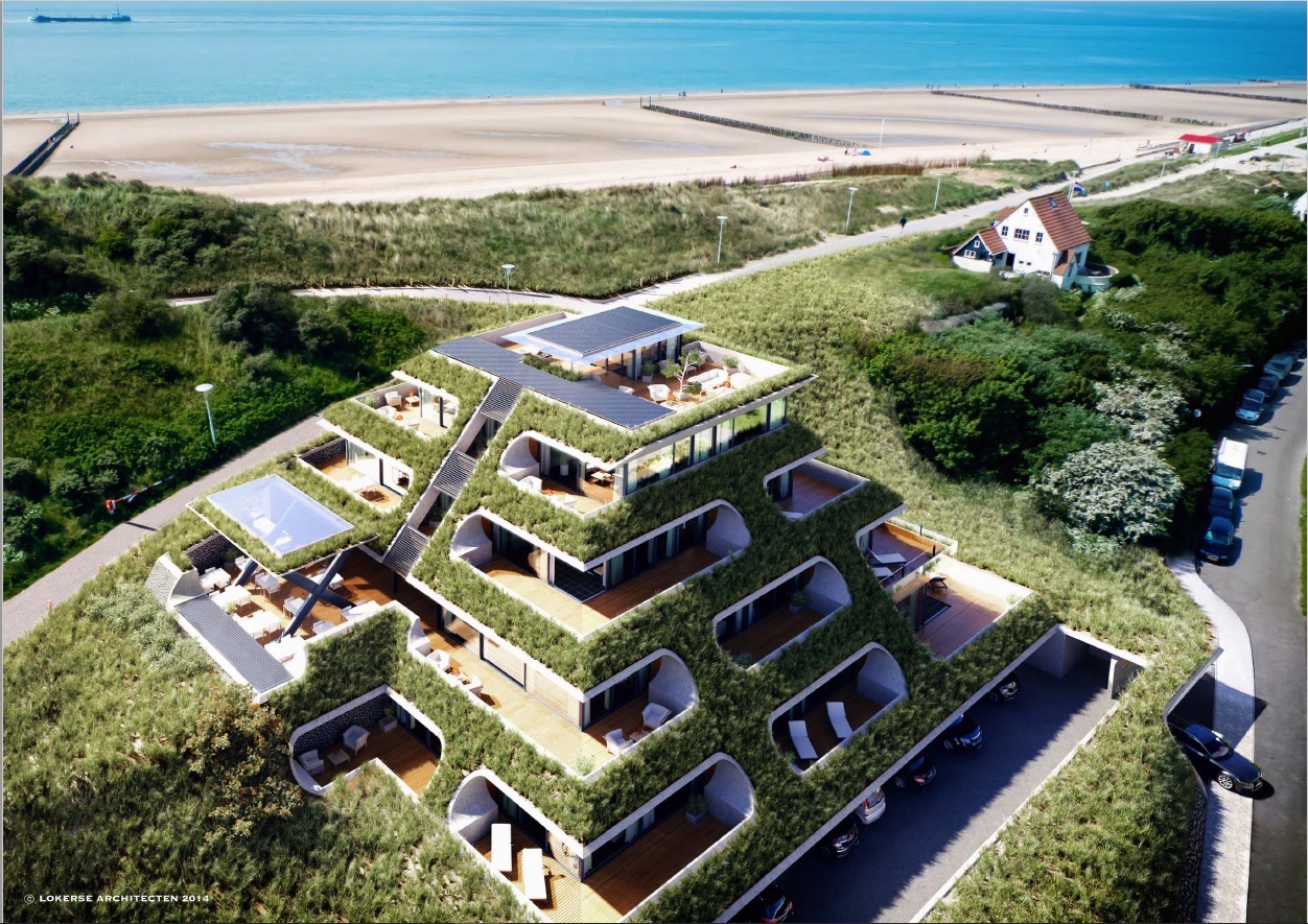 Tot voor kort was aan de Duinweg 36 in Zoutelande Duinhotel Tien Torens te vinden. Het witte gebouw heeft het veld geruimd en plaats gemaakt voor een hotel met dezelfde naam, maar daar houden de overeenkomsten op. Het nieuwe Duinhotel Tien Torens gaat letterlijk op in het landschap; helmgras bedekt het trapeziumvormige gebouw.