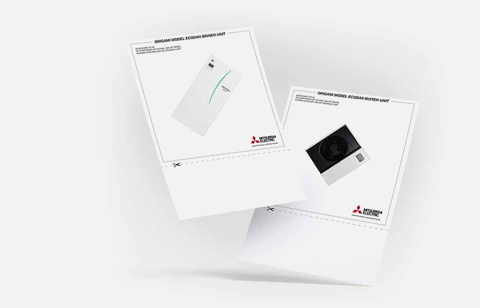 Print de origami modellen uit en knip de modellen alvast op maat. Bekijk vouwinstructies voor de Ecodan binnenunit en de Ecodan buitenunit.
