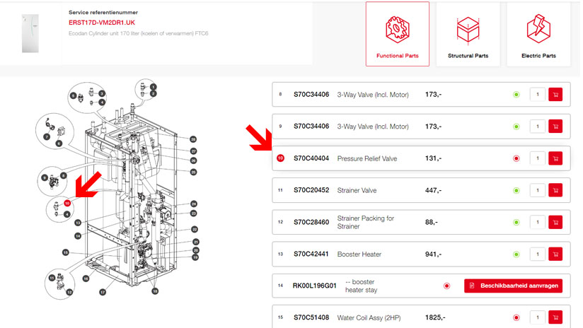Klik op  om het onderdeel te bestellen. Je kunt meerdere onderdelen toevoegen aan je winkelwagen.