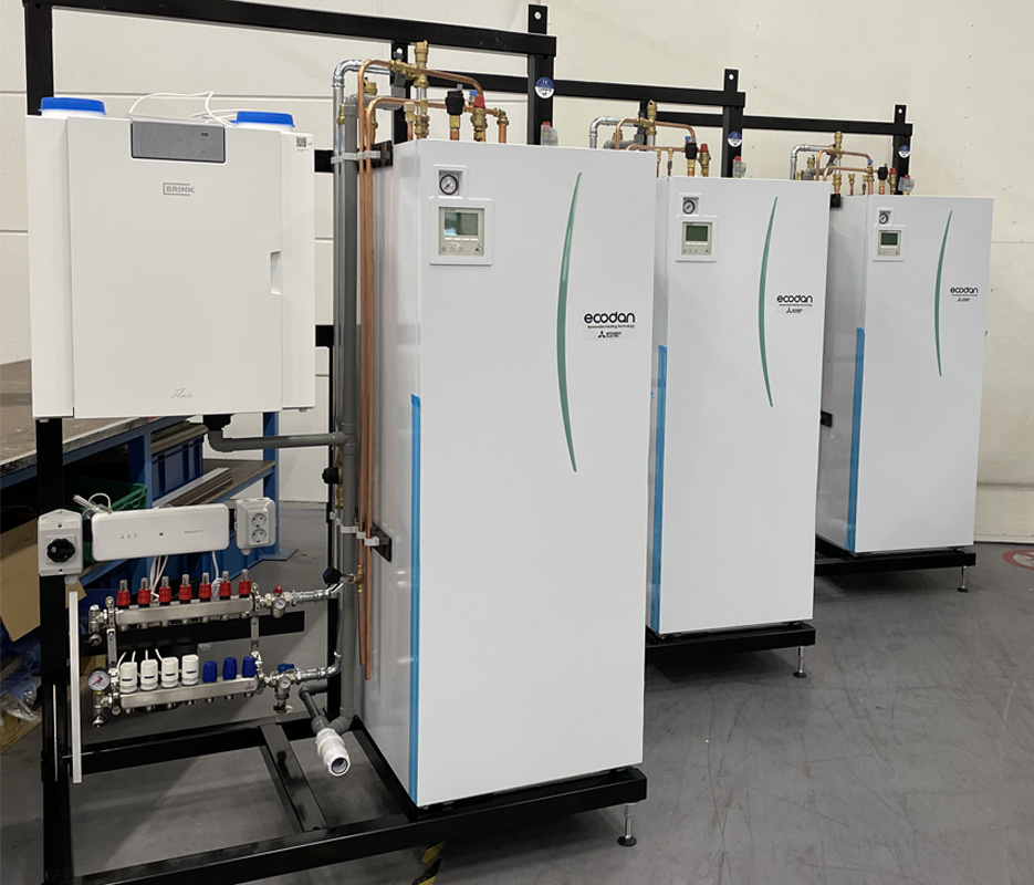 Naast de warmtepomp is op elke skid ook een ventilatie-unit van Brink gemonteerd, evenals de verdeler voor de vloerverwarming en de HCC100 multizone-regelaar van Resideo. Op de bouwplaats kunnen de monteurs de skids met relatief weinig handelingen bedrijfsklaar maken. “Het grote voordeel is dat wij in ons eigen tempo de laatste montagehandelingen kunnen uitvoeren”, zegt Colsters. “Zodra de ruwbouw gereed is, beginnen wij om vanuit de centrale leidingschachten alleen nog de koelleidingen aan te sluiten op de warmtepomp. Natuurlijk koppelen we ook de waterleiding en de ventilatiekanalen aan de unit en sluiten we de elektriciteit aan. Vanaf dat moment functioneert de installatie.” Steijns vult aan: “We leiden op dit moment zij-instromers op die dit werk ook kunnen uitvoeren. Dan hebben we alleen nog een hoger opgeleide monteur nodig om de warmtepomp en het afgiftesysteem in bedrijf te stellen, in te regelen en af te stellen. Maar op locatie kunnen we op deze manier aanzienlijk wat uren van hoger geschoolde of ervaren monteurs besparen.”