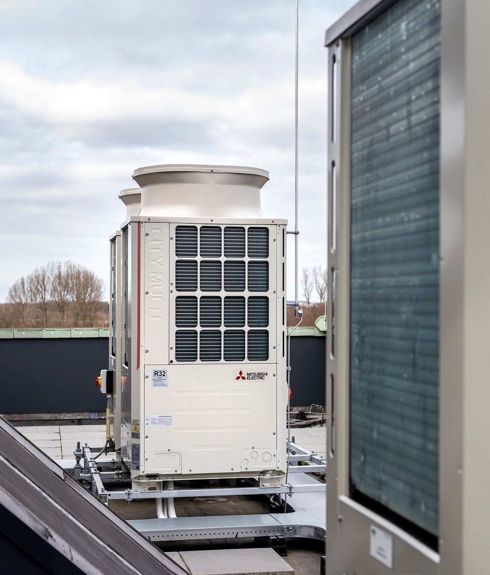 Om de complexe energiebehoefte in het gebouw te realiseren is er dus een veelvoud aan installaties toegepast. Voor de kantoren is gekozen voor een VRF R2- systeem in combinatie met kanaalunits. Hierdoor is het mogelijk om in de kantoren per vertrek de temperatuur te bepalen en kan er bijvoorbeeld in de ene ruimte gekoeld en in de andere ruimte verwarmd worden. Daarnaast wordt het gebouw aanvullend verwarmd met vloerverwarming, waarvoor weer Ecodan-systemen geplaatst zijn. Een cilinderunit maakt het warm tapwater voor de douches en pantry’s. Ook met de luchtbehandelingskasten kan gekoeld en verwarmd worden. Dit is gedaan met een PUHY-P500 in combinatie met een PAC-AH en de tweede luchtbehandelingskast heeft een cascade van 2x PUHZ-SHW230.