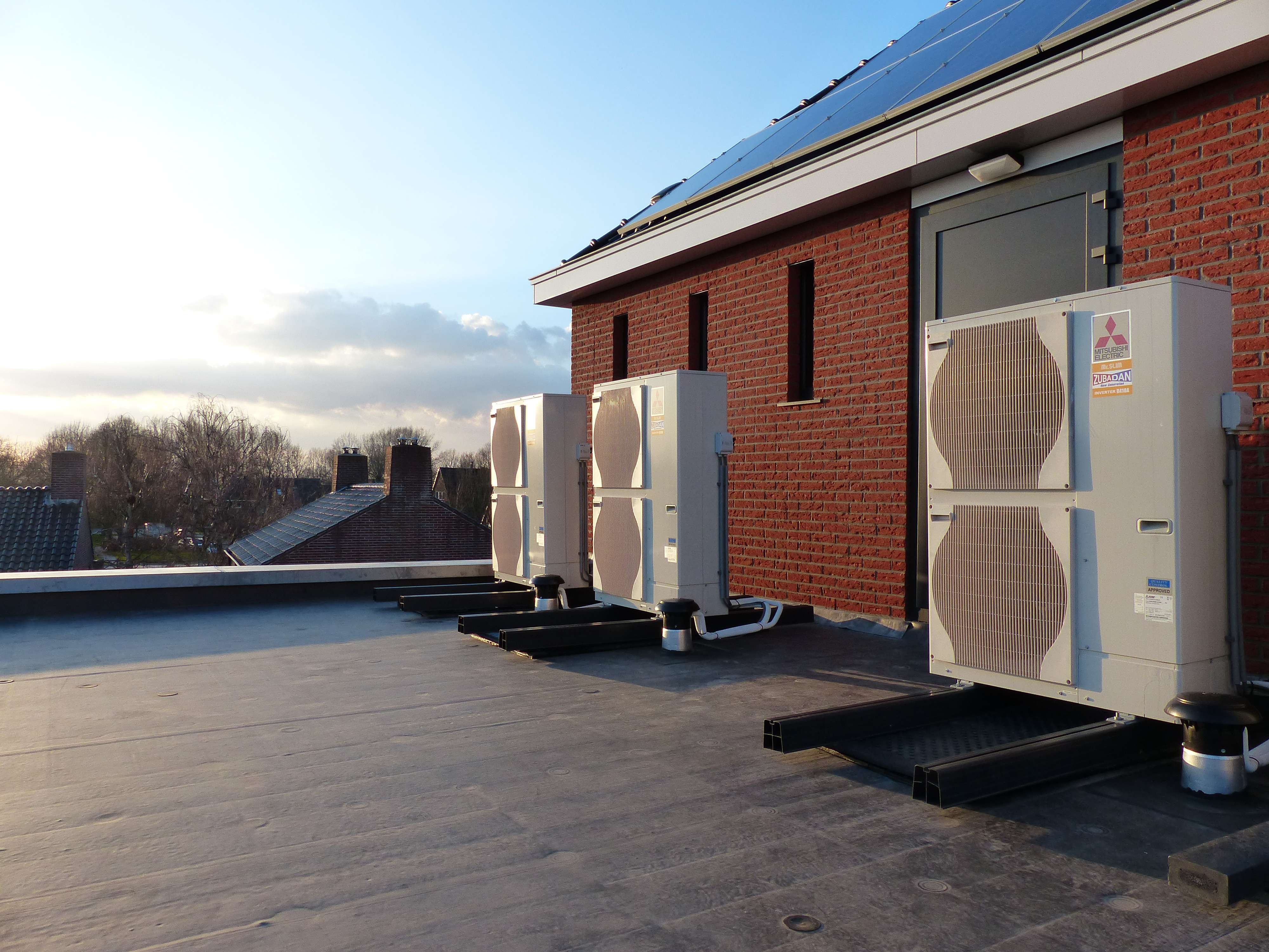 Ook de verwarmingsbron van het gebouw is daarbij vervangen, en daarbij werd zelfs afscheid genomen van de aansluiting op de gasinfrastructuur. In de allereerste bouwplannen werd gedacht aan een bodemgebonden systeem, maar uiteindelijk is toch gekozen voor lucht-/water warmtepompen. Van Dorp: "Uit berekeningen bleek dat we met lucht/water een even hoog rendement zouden halen, tegen een veel lagere investering. Het gebouw wordt nu verwarmd en gekoeld met behulp van twee Ecodan-warmtepompen van Mitusbishi Electric. Bij een buitentemperatuur van 7 C en een afgiftetemperatuur van 35 C moeten ze een COP kunnen behalen van 5,2 - en misschien zelfs wel hoger."