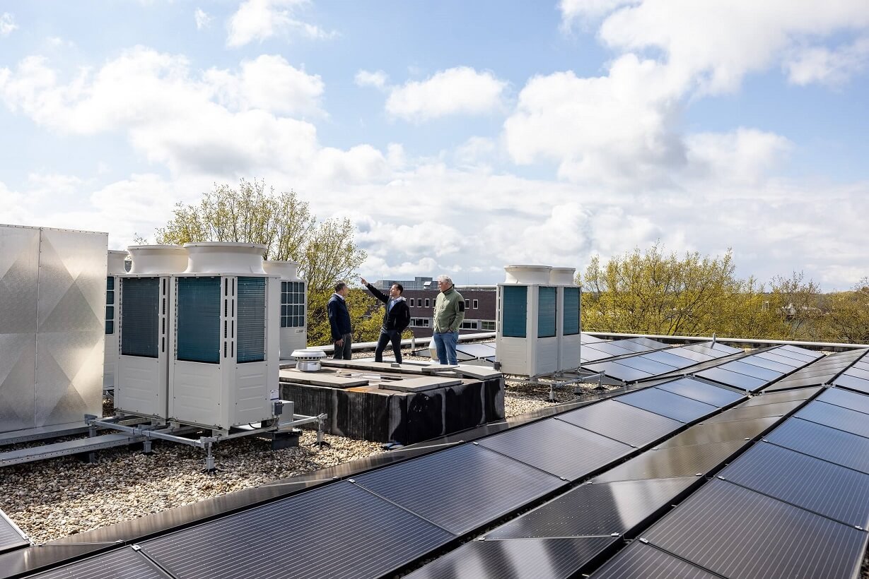 “Stel je voor dat iemand op de derde verdieping achterin de hoek het koud heeft en de verwarming aan wil, maar de rest van het kantoor heeft behoefte aan koeling, dan kan dat.” Aan het woord is Richard Hegeman van Van Kooten Installatietechniek. Hij vertelt dat de installatie in het nieuwe gebouw van Ecare Services op Kennispark Enschede zo is ingericht, dat het binnen het gebouw mogelijk is om ruimtes afzonderlijk van elkaar te verwarmen of te koelen. Het is een innovatief kantoor geworden dat moderne warmtepomptechniek combineert met vloerverwarming- en koeling en VRF-binnenunits tussen de plafonds.