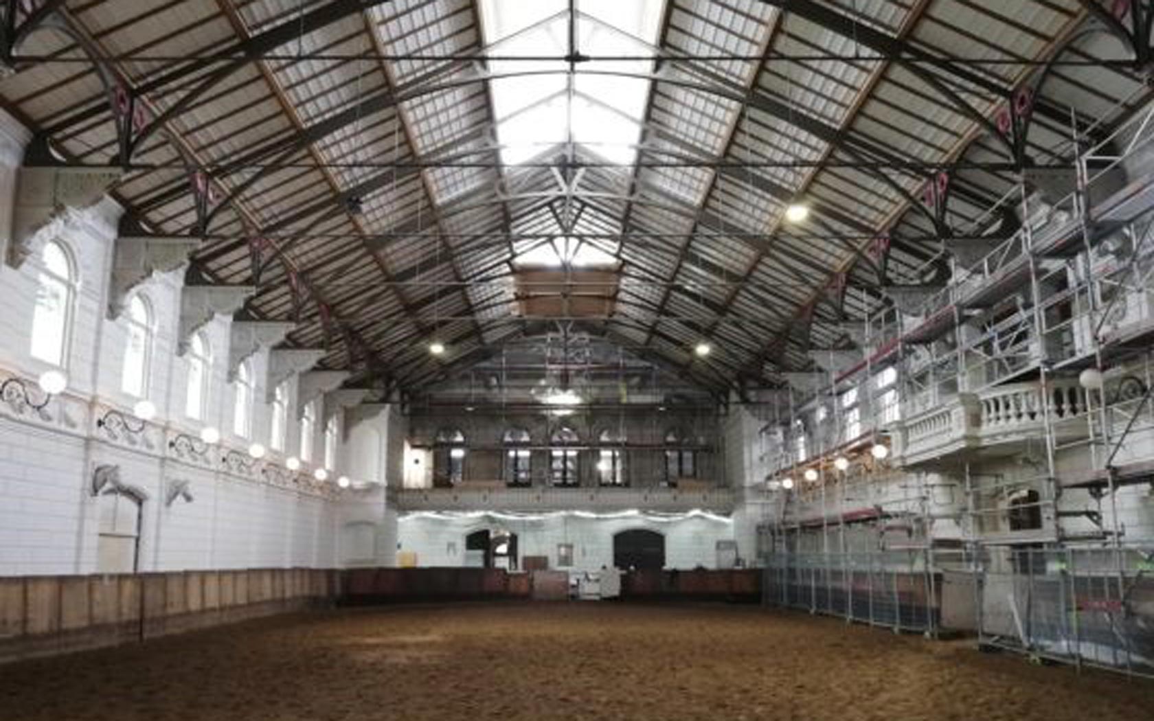 De manege binnenlopen is een imposante ervaring. Het pand werd gebouwd naar voorbeeld van de Spaanse