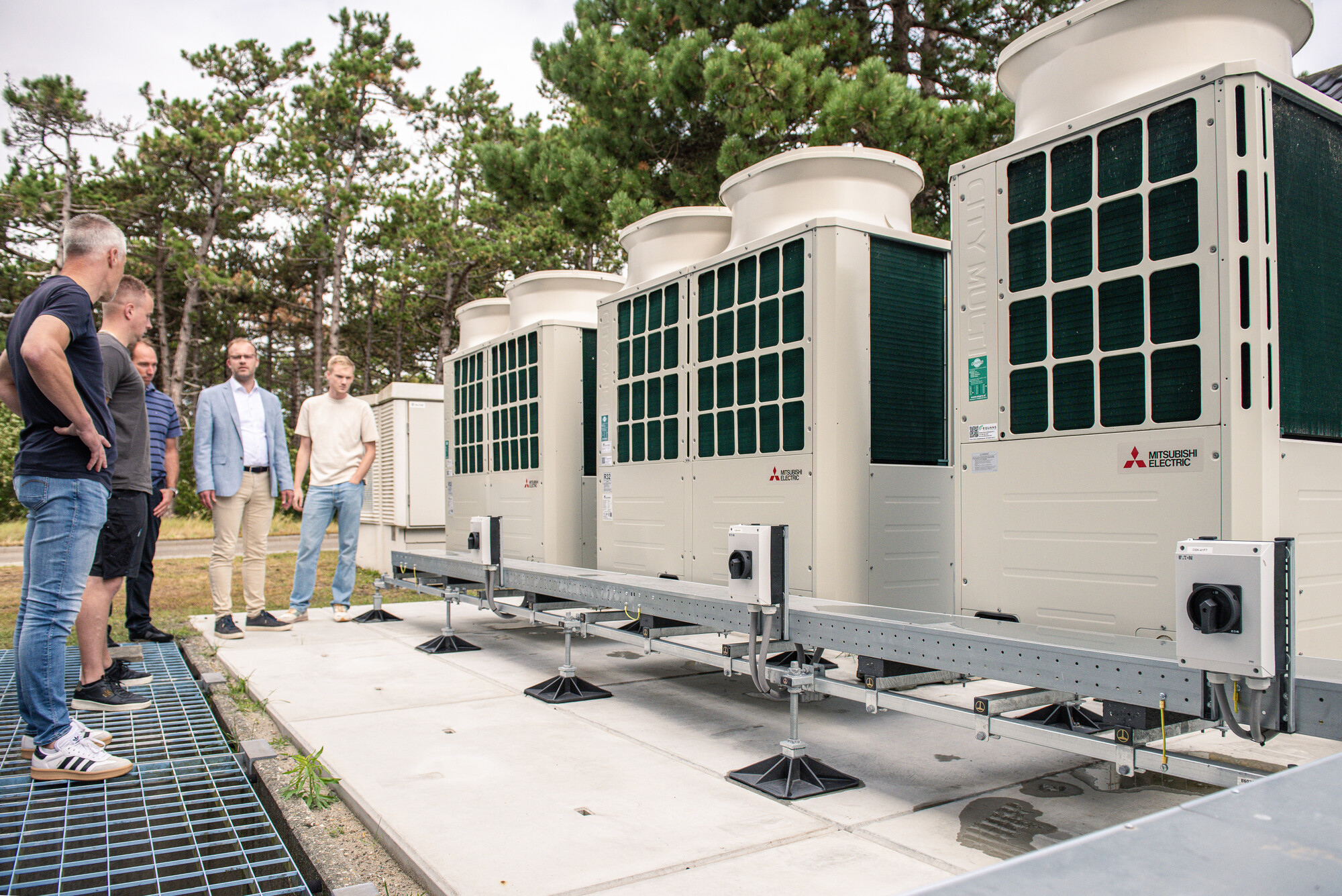 Sinds 2019 breidde het MSTC uit met circa 60% extra vloeroppervlak en nieuwe simulatoren. Toen kwam er al een extra buitendeel bij. Voor de begane grond en eerste verdieping volgde in 2025 een complete vervanging. Niet omdat het oude systeem faalde, maar omdat nieuwe milieueisen en beleid van NHL Stenden minder koudemiddel in verblijfsruimtes vereisten. “We wilden minder koudemiddel en een lagere GWP-impact”, licht Van den Oever toe. “HVRF past daar precies bij.” De keuze viel op Mitsubishi Electric City Multi HVRF (Hybride VRF). Buiten circuleert koudemiddel, binnen zorgt water voor het transport van warmte en koude. Daardoor daalt de hoeveelheid koudemiddel in het gebouw flink, terwijl het warmteterugwinprincipe intact blijft.